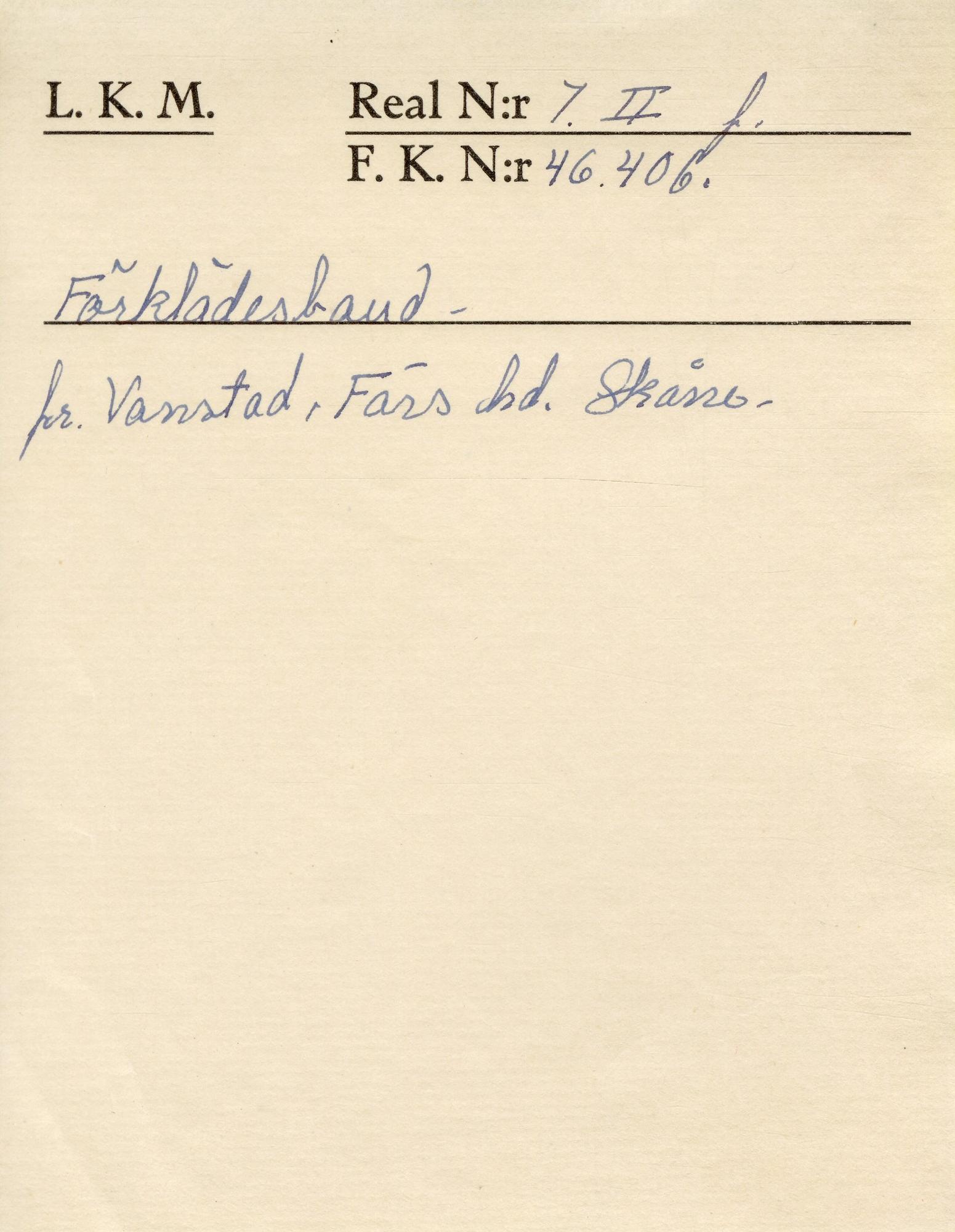 - Varp: i botten av två trådar oblekt lingarn, mönster av två trådar rött och grönt ullgarn. Inslag av två trådar oblekt lingarn. Upplockat mönster. Gallerliknande avslutning med fyra tofsar. Längd utan tofsar: 241 cm. Längd tofs: 8 cm.