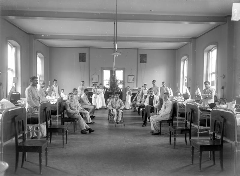 Lund, sjukhusinteriör. Läkare, sjuksköterskor och patienter, Lunds Lasarettet, omkring 1910.