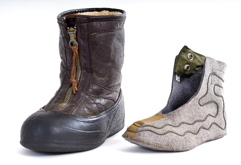 Överdelen av läder. Underdelen som en galosch. Fodrade med lammskinn och el-element monterat inuti. Knäpps med blixtlås, dragkedja. Inuti löstagbar filtkänga 1 stycken med fastsydda el-element. På kängan finns ett vittgrönt tyg fastsydd i dess överkant. På denna sitter två trycknappar som skall anslutas till eluttag. Ytterpjäxa: L 33 cm, H 25,5 cm, Br 12,5 cm. Filtkänga: L 28,5 cm, H 17,5 cm, Br 10 cm.