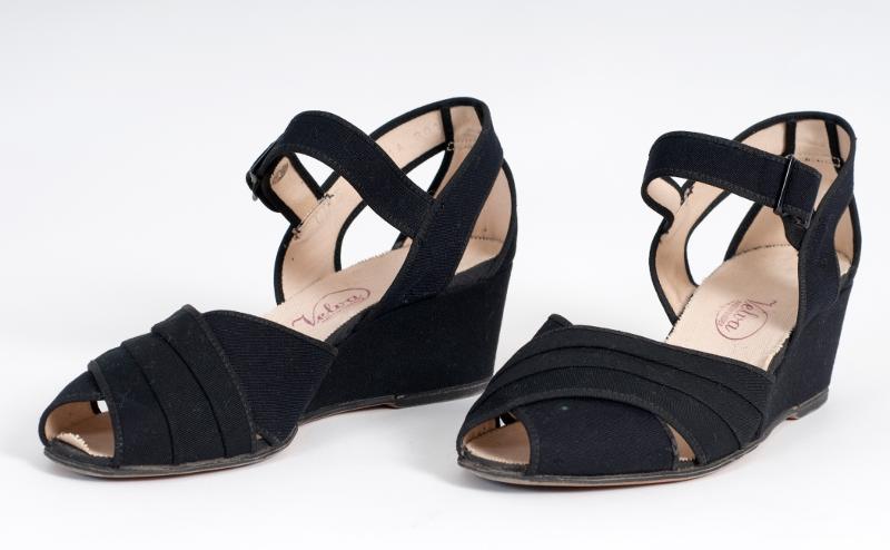 Svart ripstyg, sandaltyp. Vristrem. Kilklack, pliggad, rätt hög. Bakkappan utskuren. Två breda, veckade, korslagda band över tårna. Vit innersula i tyg. Längd sula: 23,5 cm. Klackhöjd: 5,5 cm Klackbredd: 4,1 cm. NR 5. Signerad: Velva/ Made in Sweden. Defekter: Ena innersulan har lossnat något i tån. Sulorna är slitna.