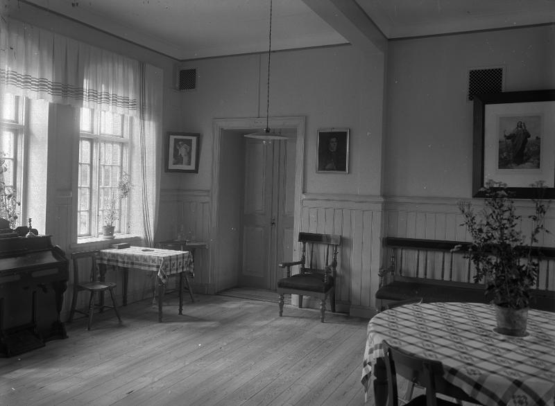 interiör; fönster; gardin; taklampa; bord; soffa; duk; blomkruka; växt; tavla; stol; golv; dörr; orgel; mentalsjukhus