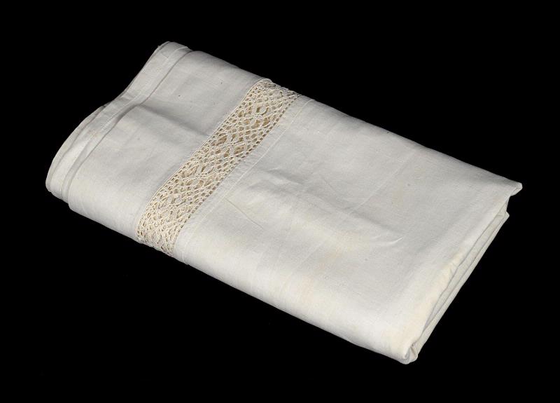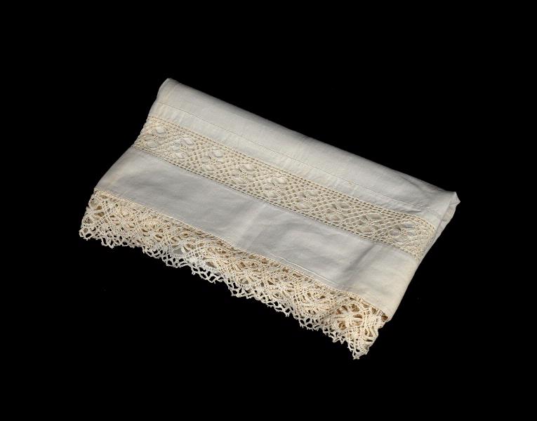 Vitt linne, med infällda bårdspetsar och kantspets.