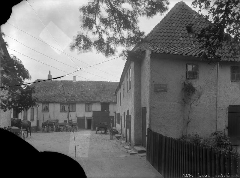 stadsbebyggelse; hus; byggnad; kullersten; träd; korsvirke; gårdsplan; häst; vagn; person; man; staket; växt; skylt