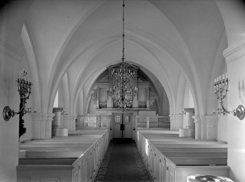 Stångby. Stångby kyrka. Interiör. Vy mot orgelläktaren.