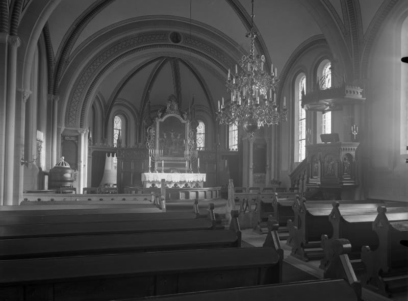 altare; altarring; altartavla; kyrkbänk; kyrkointeriör; ljuskrona; ljusstake; predikstol