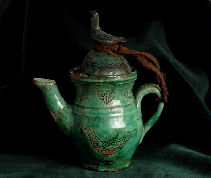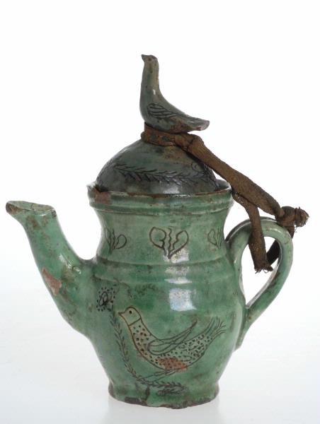 - Med pip och handtag. Grönglaserad med brun sgraffitodekor med blommor och fåglar, under pipen årtalet 1855. Locket toppas av en skulpterad fågel. Skador: locket trasigt endast 1 del av locket finns kvar.
