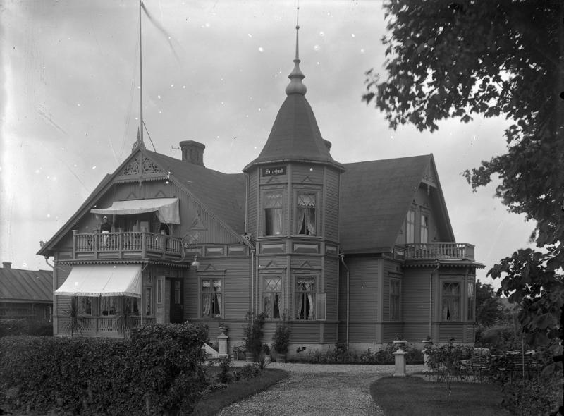 En villa eller kanske en herrgård, Sirishult. En kvinna, troligen husfrun står på husets balkong.