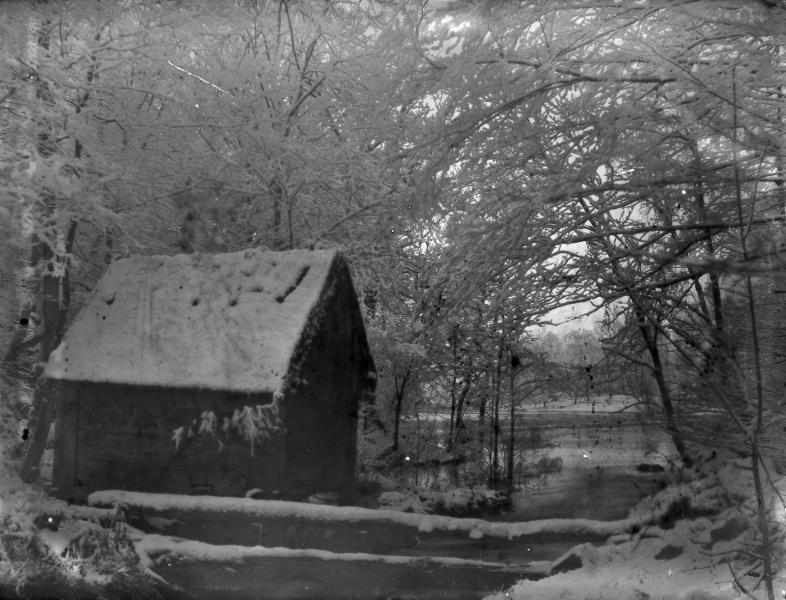 Stuga vid ett vattendrag i skogen på vintern.