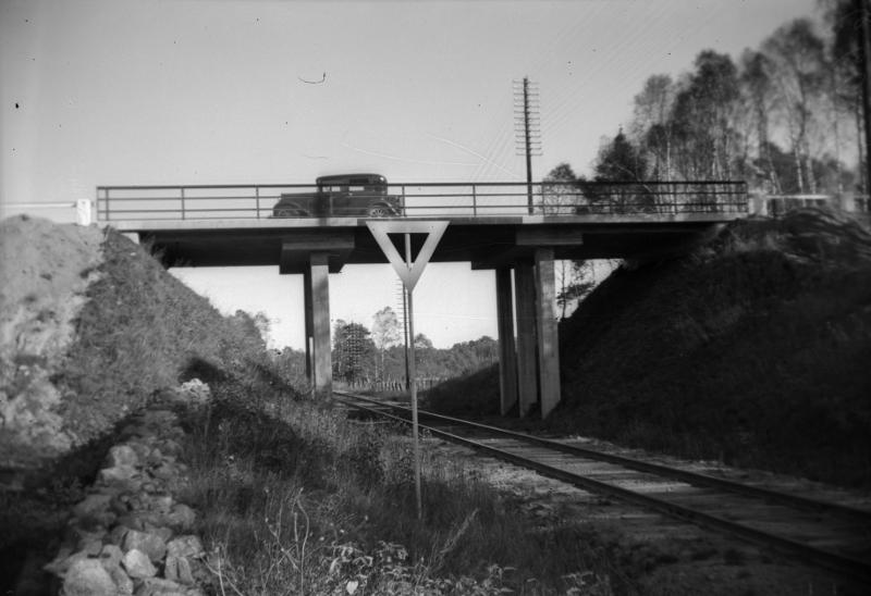 En bil på en bro över järnvägen.; Per Stjernbergs i Perstorp (f.1856, d. 1940) plåtsamling. Landskapsbilder. (N:r 444-572).