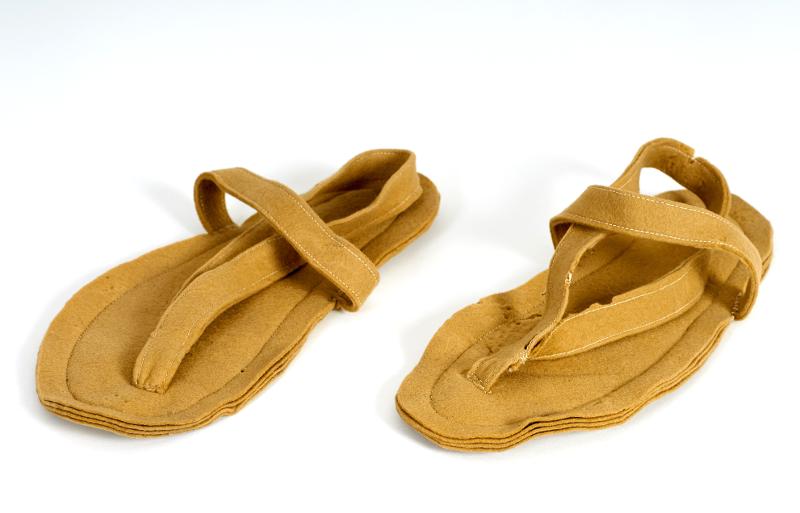 - Av grågult ylletyg eller filt i fyra lager. En rem över vristen och hälen. En ögla från mellanrummet mellan stortån och runt hälen. Defekter: svärtade, fläckor på undersidan; större höger; något maläten, båda.