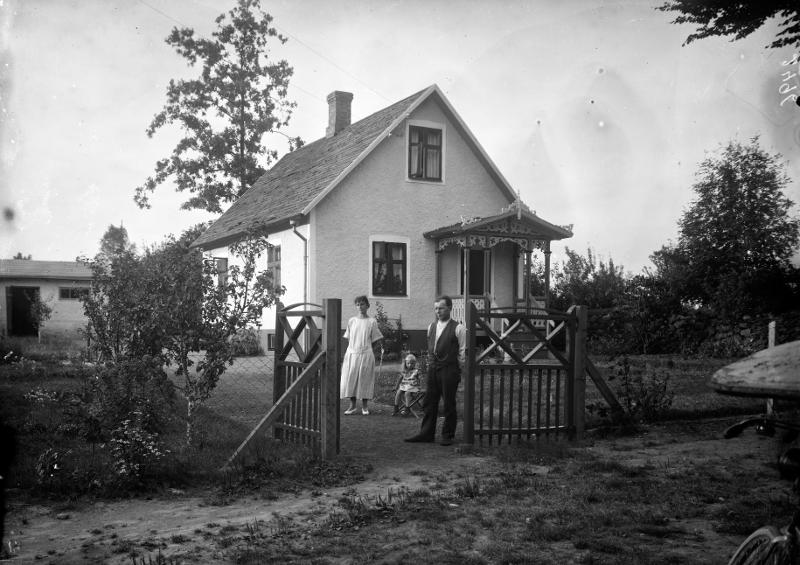 En familj som står vid grinden nära ett hus.