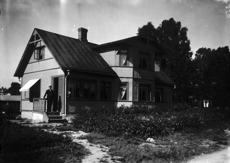 landskap; himmel; hus; villa; trädgård; buske; växt; träd; markis; person; man; ungdom; kostym; krage; fluga; studentmössa