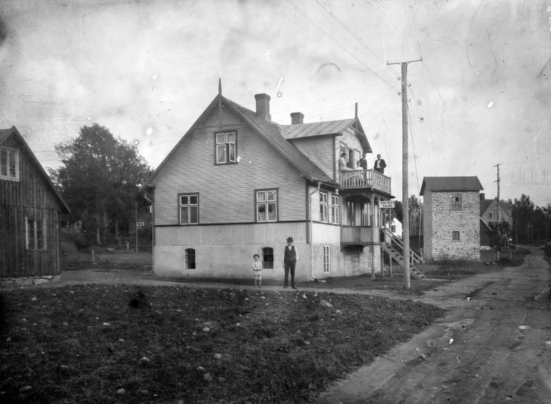 landskap; väg; bebyggelse; hus; balkong; person; man; kvinna; barn; djur; hund; pojke; elstolpe