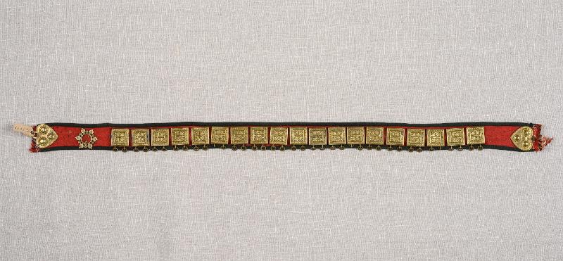 Bälte kvinno- . Mässingsplåtar, 19 st med stiliserat blommönster och två hängande ringar. 2,8 x 2,8 cm. Plåtarna sitter genom att deras två öglor trätts genom tyget och i sin tur är genomdragna på baksidan av ett skinnsnöre.