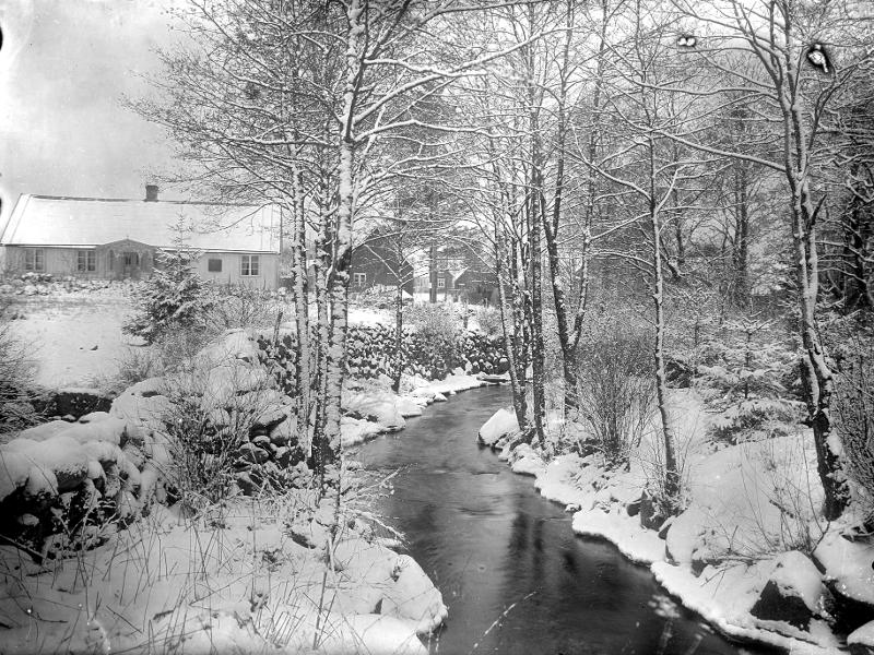 Ett hus och en å på vintern.