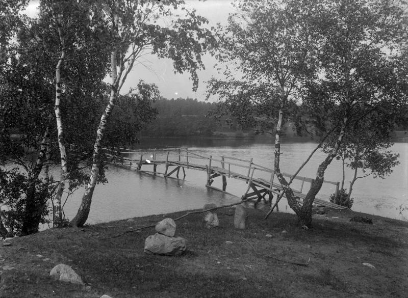 Träbro över en sjö intill två björkträd. / Historisk Bildbyrå.