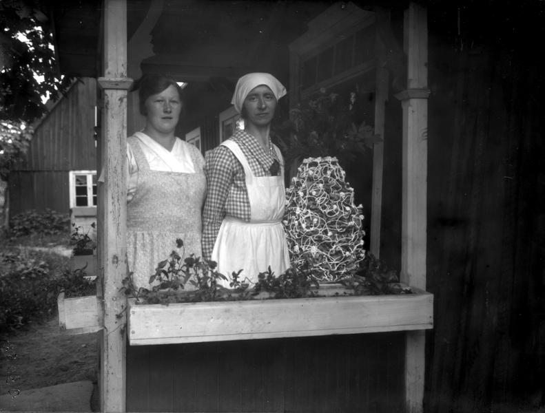 Två kvinnor står vid en blomlåda utanför ett hus.