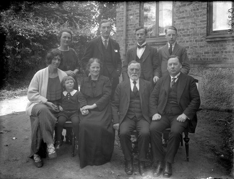landskap; grupporträtt; hus; träd; buske; växt; stol; person; man; kvinna; barn; pojke; barnklädsel; strumpa; sko; krage; frisyr; klänning; kofta; ring; kostym; väst; näsduk; slips; fluga; kedja; slipsnål; familj