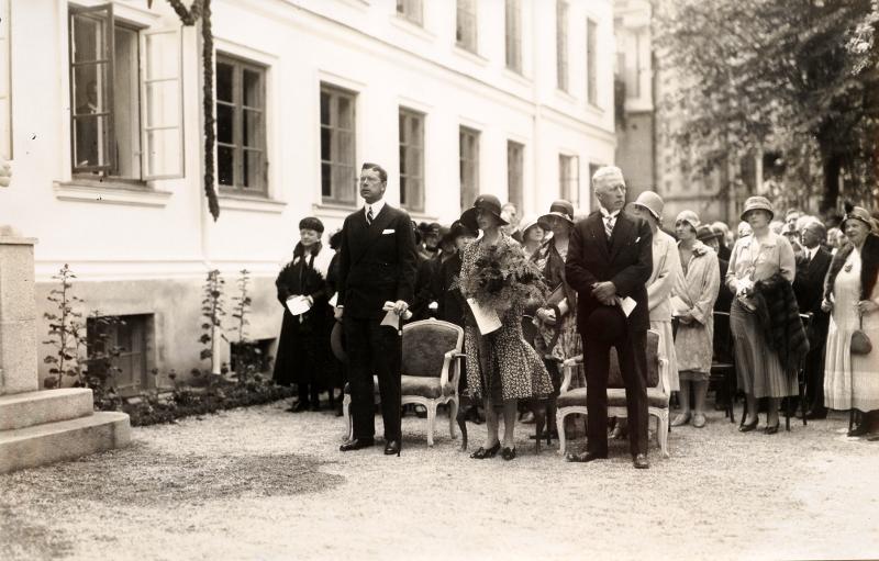 invigningen av Vita huset, Kulturen, 10 augusti 1929. Längst fram står kronprins Gustav Adolf, kronprinsessan Louise och prins Eugen. Herrarna har tagit av hatten. Kronprinsessan med en gigantisk blombukett. Bakom sitter övriga deltagare. Ett fönter står öppet och man skymtar en man. Rabatten är nyplanterad.