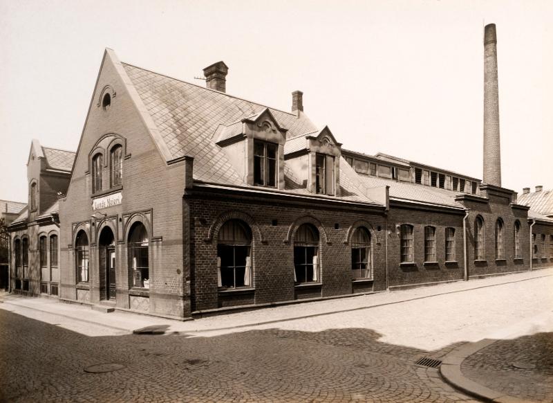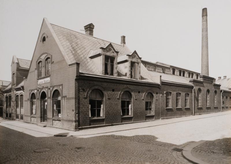 Svartvitt fotografi av Lunds Mejeri Bolag i hörnet av Själbodgatan och Magle Stora Kyrkogata. Mejeriet var Lunds första och uppfördes av godsägare Gottfrid Warholm. Byggnaden i rött och gult tegel i mönstermurining och rundbågiga fönster och dörrar. 1912 fick mejeriet en tillbyggnad i rött maskintegel utmed Själbodgatan. Det lades ner 1949, men butiken fortsatte att fungera. Den blev så småningom en vanlig speceriaffär fram till 1977 då den stängdes. Byggnaderna revs i december 1982.