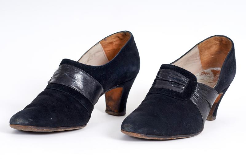 Svart mocka med besättning av chevreau över vristen. Skuren i framstycke, fodrat med vitt bomullstyg och bakstycke med baknåt, fodrat med ljust skinn. Innersula av ljust skinn. Hög, smal klack av trä, klädd med mocka. Klacksula av läder. Sula av läder som går ner över klackfronten. På innersidan tryckt: 7478. Mått: klack H 6 cm, Br 3 cm.