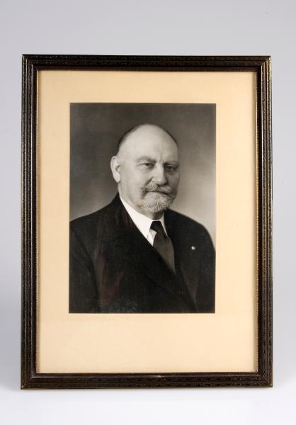 Fotografi, svartvitt, Sigurd Timberg, ateljéfoto, bröstbild. Fotograf Per Bagge. I metallram med två rader mönsterslingor och innerst pärlstav.