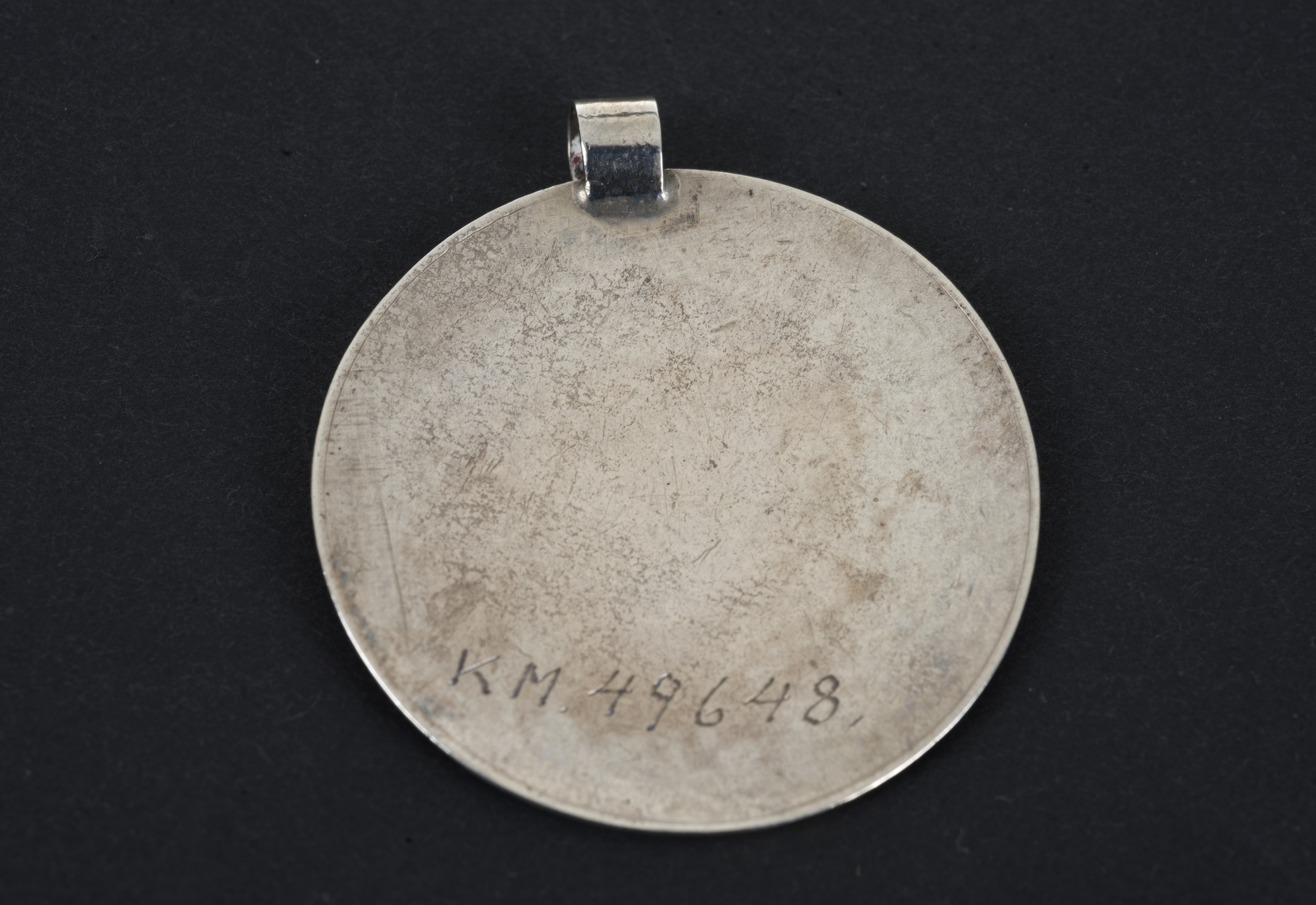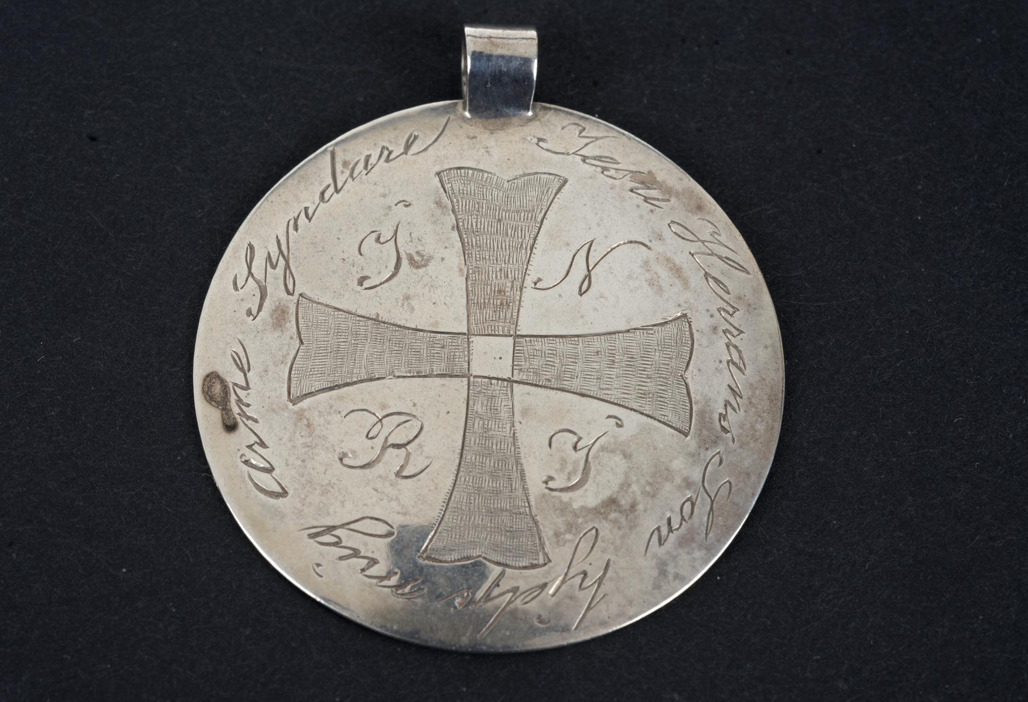 På framsidan ett graverat kors och inskription Jesu Herrans Son hjelp mig arme Syndare - INRI, pålödd hängögla