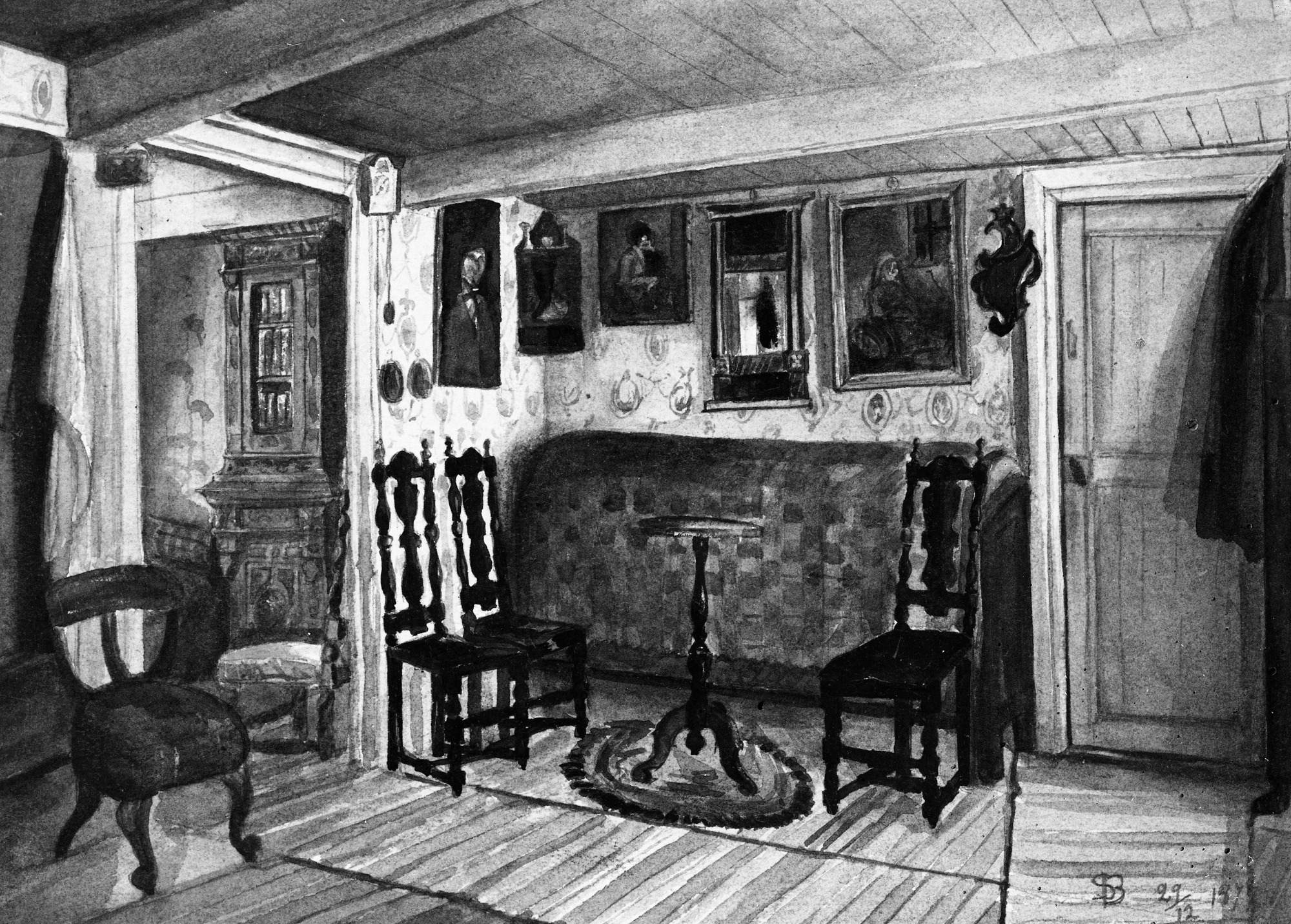 Interiörer från skulptören Sven Bengtssons barndomshem, akvarell.