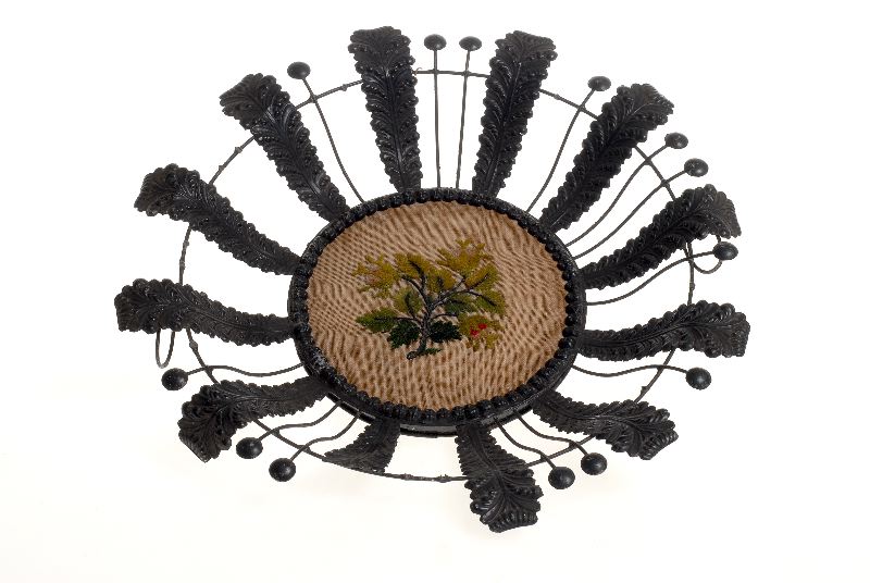 Av pressat bleck, svartmålad, rund, genombrutet, profilerat brätte av metallblad med pressad dekor och mellan dem ståltrådar, botten med polykromt korsstygnsbroderi.