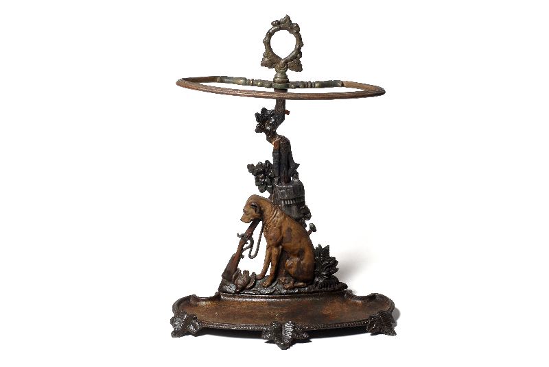 Jaktmotiv med hund, gevär och skjuten fågel. Bottenplatta med tre bladfötter framtill. Reliefgjuten dekor, guldbronserad. I fotskålen spår av ljusgrå målning.