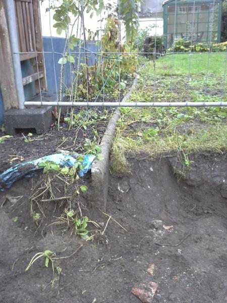 Trädgårdsbild från Kv Fredrik 8, Ystad, i samband med undersökning. Kantstödet på bilden inskriven i Kulturens samlingar: KM 94550