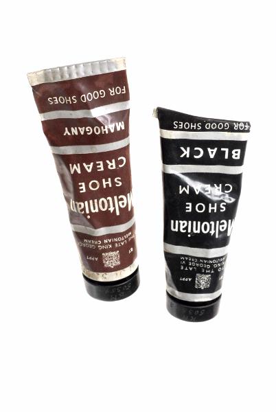 Med svart och brunt skokräm, "Meltonian shoe cream".