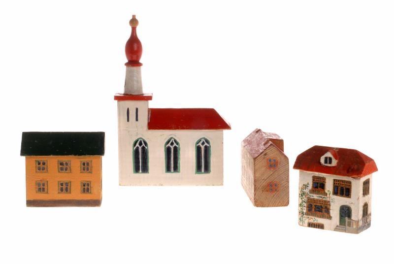 2 1/2 plan, fönster i orange och blått. Skador: skorstenar saknas, nedkladdat m. röd och grön krita. Vårdåtgärder: rengjort m. pensel.