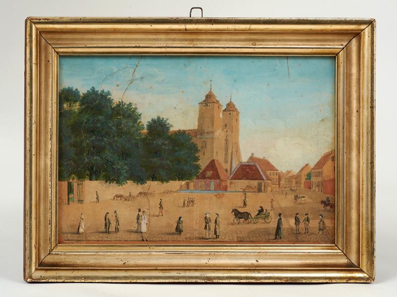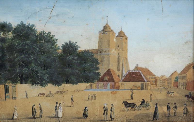 "Målning, akvarell och gouache, målad av Gustaf Wilhelm Palm 1828. Lilla torg i Lund med Domkyrkan och den gamla lundagårdsmuren mot väster med sin gallergrind krönt av lilla riksvapnet. Grinden är ritad av Carl Hårleman och är nu entré till Kulturen."