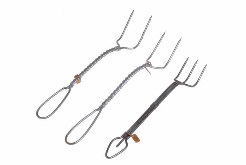 Av grov ståltråd, två st med snodda skaft.