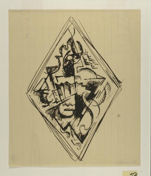 Rombisk bild. En av flera skisser/förarbeten till målningen. Rombisk komposition som senare övermålades. En firgur kan anas i kompositionen. Utförd på linjerat anteckningspapper.