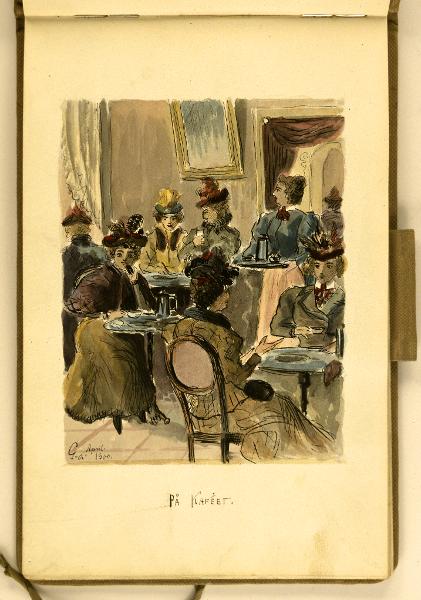 Damer i café miljö, i underkanten texten På Kafeet.; Ingår i skissbok KM 50794.140