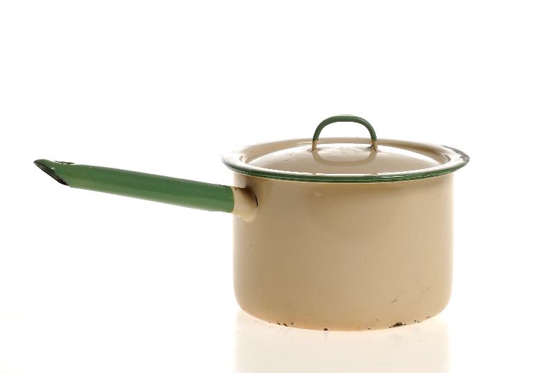 Krämfärgad emaljering och grönfärgad emaljering på mynningskanten, rak sida, rund, grönemaljerad grepe, till kastrullen hör ett lock.