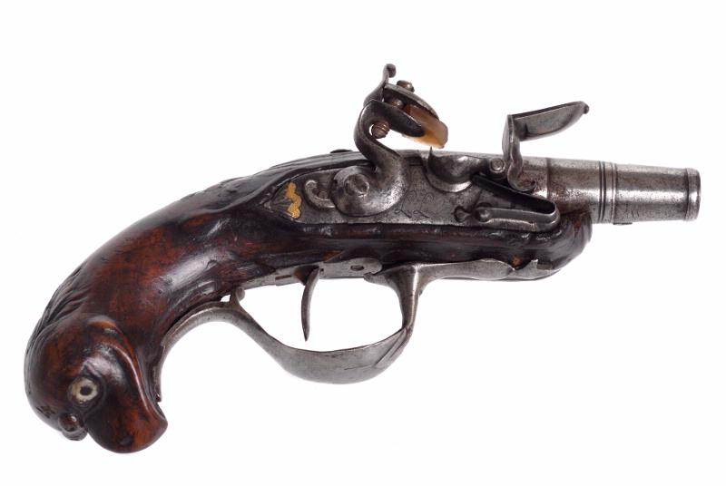 - Flintlås, slätborrad. Fickpistol med kort, avskruvbar pipa. Valnötsstocken har på ovansidan en snidad blomma och kolven är tillverkad i form av ett fågelhuvud med ögon av pärlemor.