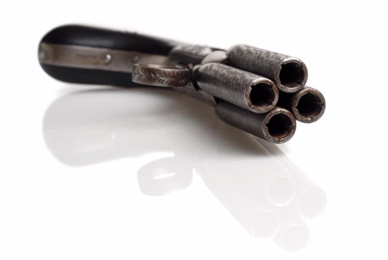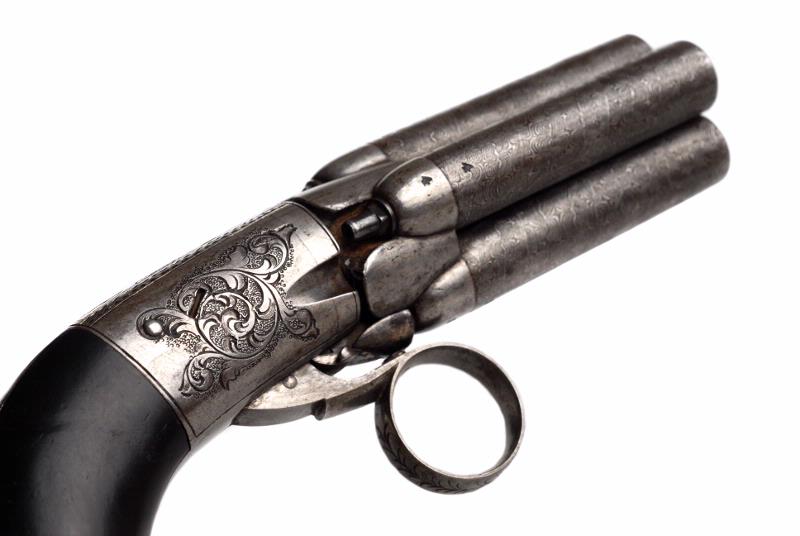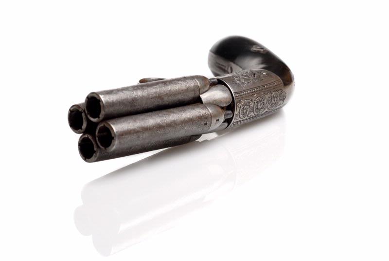 Ur utställningskatalogen: Belgaren Mariettes och amerikanen Allens revolvrar hörde till de mer spridda av de nya revolverkonstruktionerna från 1830-1850. Knippet med pipor är vridbart kring eb axel och skruvas av vid omladdning. Hanen spänns när avtryckaren dras tillbaka.
