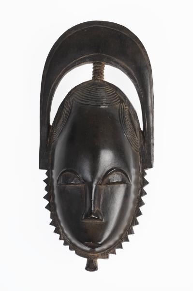 Skulpterat stiliserat ansikte med ett genombrutet parti mellan hjässa och huvudbonad, taggig kant från öra till öra. Svartfärgat, polerat.