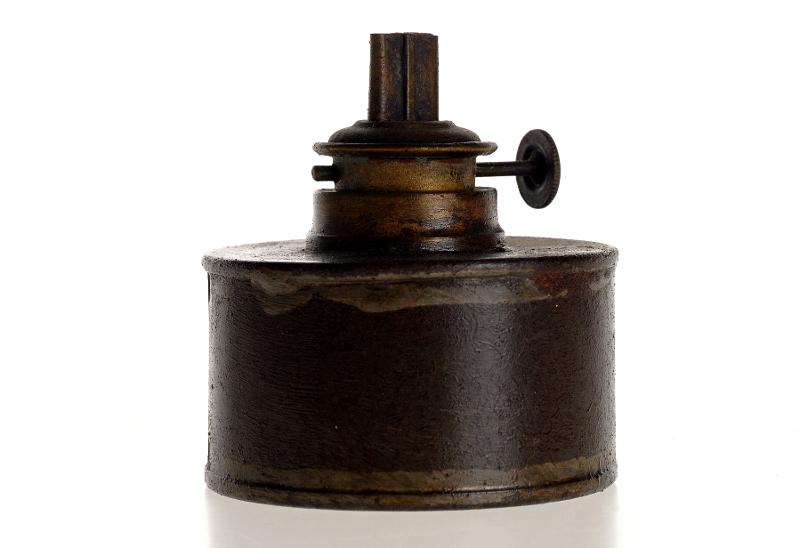 Oljehus till lampa, av bleck, med brännare av mässing.