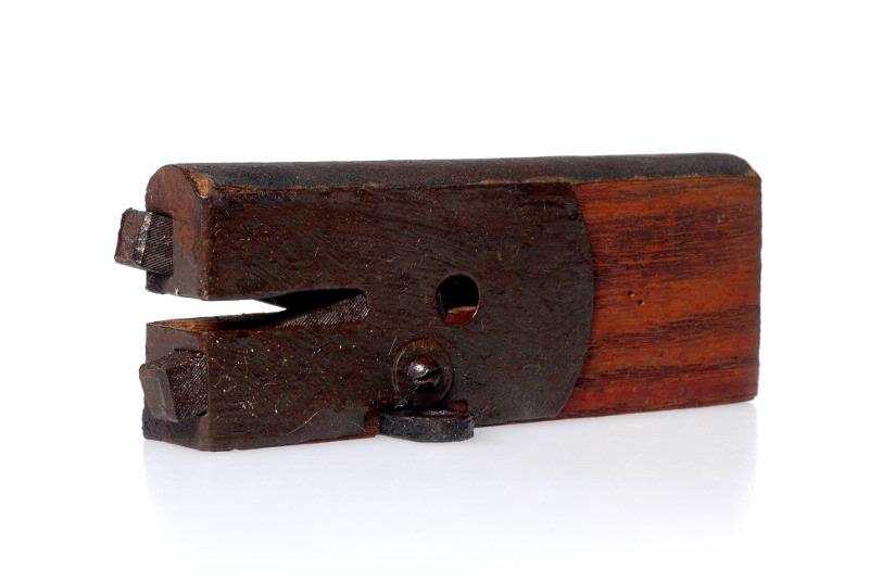 Rektangulär ställning med en välvd sida, inskuret hak med tvenne snedställda, refflade tenar, beslag.