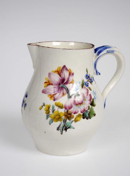 Mjukt porslin. Bukig med polykrom blomsterdekor över glasyr i gult, blått, grönt och mangan i mynningsrand, blå dekor på handtaget.
