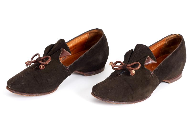 - Mörkbrun mocka; med rosett. Inbyggd klack. Ovanlädret skuret i framstycket med mittsöm. Framstycket går upp som en veckad plös. Bakstycket skuret med baksöm och fodrat med ljust skinn. Innersula av samma skinn. Rosetten och plösens foder av mörkbrunt skinn. Vändsydda. Mått: klack H 1 cm, Br 5,2 cm. Defekter: lagade i mittsömmen fram; slitna vid hällinningen; slitna sulor.