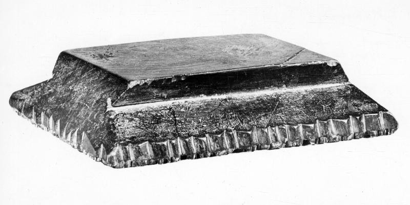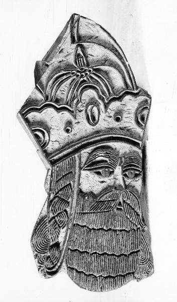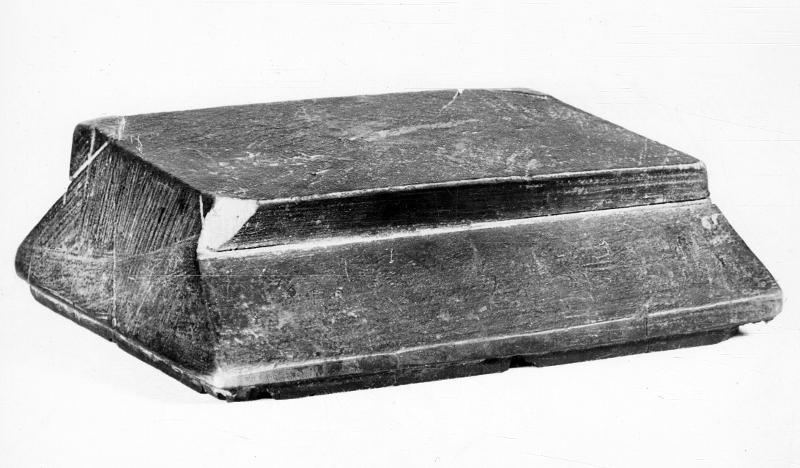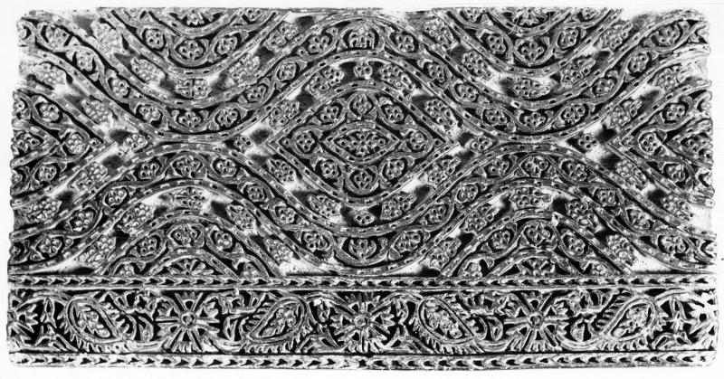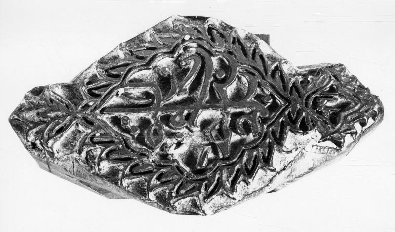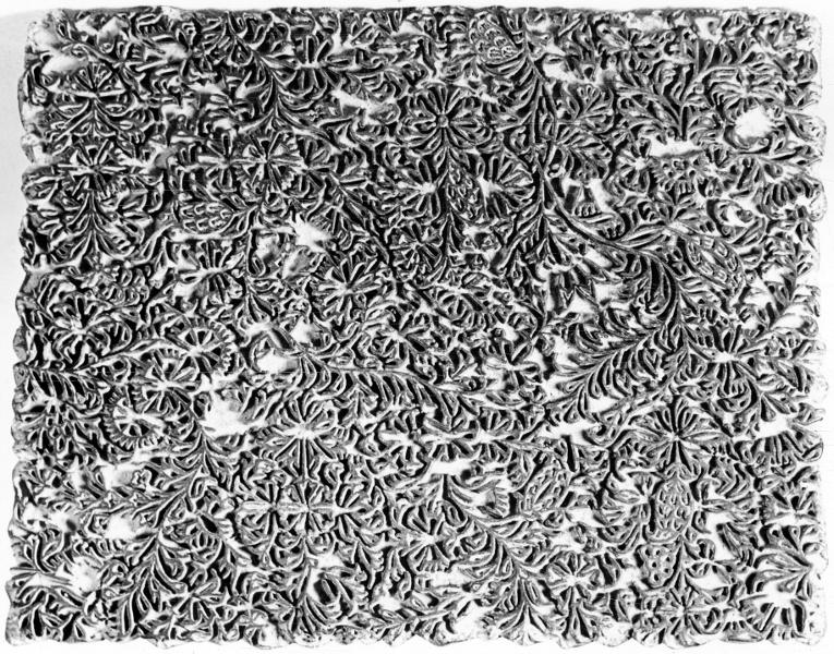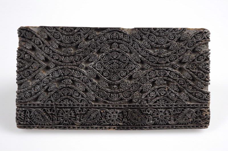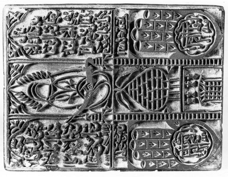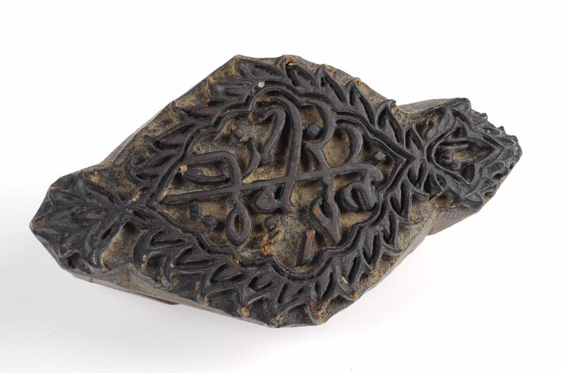 Tryckstockar av trä med motiv av: sagokung; mittstycke till täcke; bönen mot onda ögat; tryckarsignatur; bård.