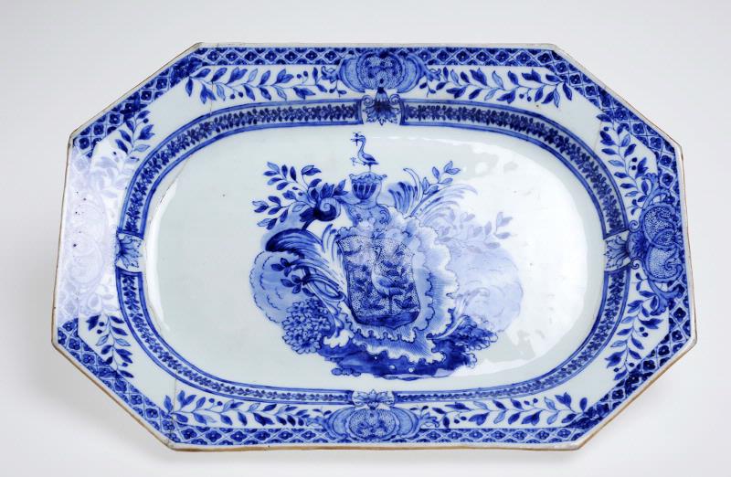"F.n. känner man till inte mindre än sex olika serviser med det grillska vapnet återgivet, med eller mindre förvanskat i sin heraldiska utformning. Här återges ett åttkantigt uppläggsfat med dekor i underglasyrblått, vars bårder ännu ligger Yung-chêng-tidens nära men uppblandats med europeisk rokoko. Dateringen bör vara 1740-tal....Lagerkrantz [Bo] har också sökt tidsbstämma servisrna. Till de äldsta räknar han just servisen med dekor i underglasyrblått, till vilket det åttkantiga uppläggsfatet hör. Dekoren vill han på goda grunder tillskriva Christian Precht och tillverkningstiden anser han vara 1740-talet."