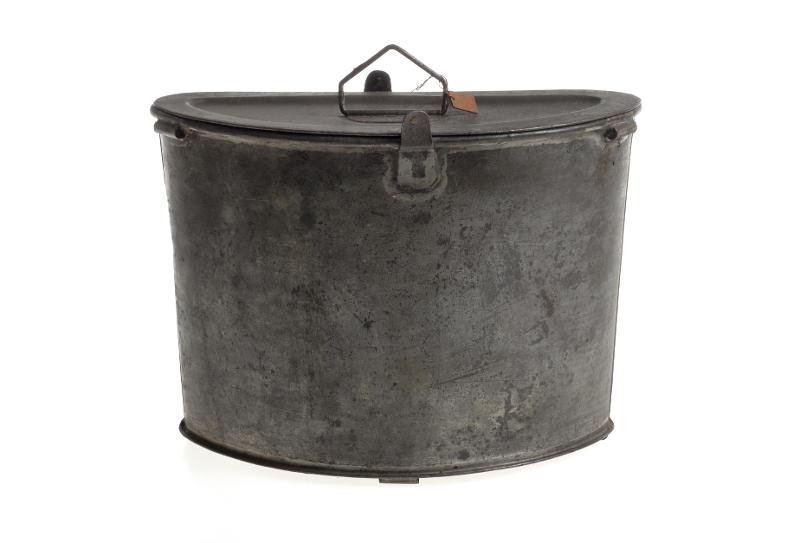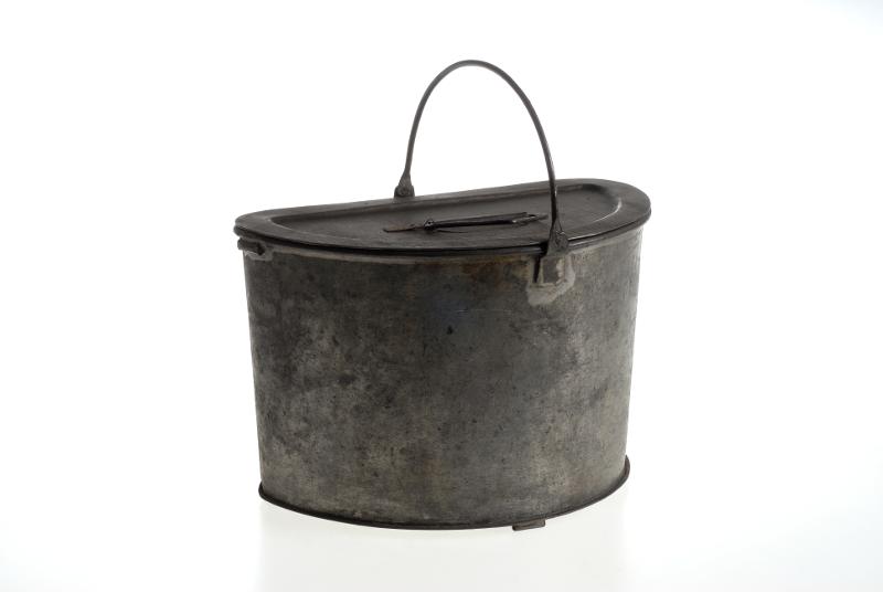 Av bleckplåt, en större och en mindre, med lock och grepe. En sida rak, avsedda att ställas i ett fodral.