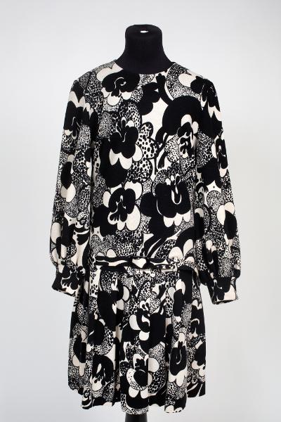 Långärmad ullklänning. Svart-vitt blommigt mönster; VARFÖR INTE av Sven Fristedt. Rund halsringning. Avskuren vid höften, låg midja med hakar för skärp. 3 cm brett skärp i samma tyg med svart plastspänne. Livet är sytt i 1 del fram och 2 bak, blixtlås mitt bak. Vid, veckad kjol. Ballongärmar med bred mudd. Märkt ”Syprov”. Modell 348 i kvalitet 7207 MAYERLING, färg 1.