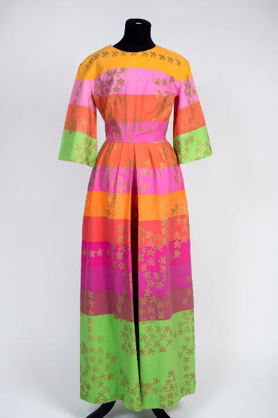 - Byxdress, byxklänning, med 3/4 trumpetärm i mönster HORISONTRAND av Sven Fristedt, i rosa-orange-grönt med blommor i guld. Långa ben, 2 stora veck i midja som i sin tur har 3 mindre veck var, både bak och fram, ger 65 cm vida ben. Blixtlås mitt bak, figursydd, rundad hals, med infällda fickor i båda sidor. Kvalitet 910, färg 6.